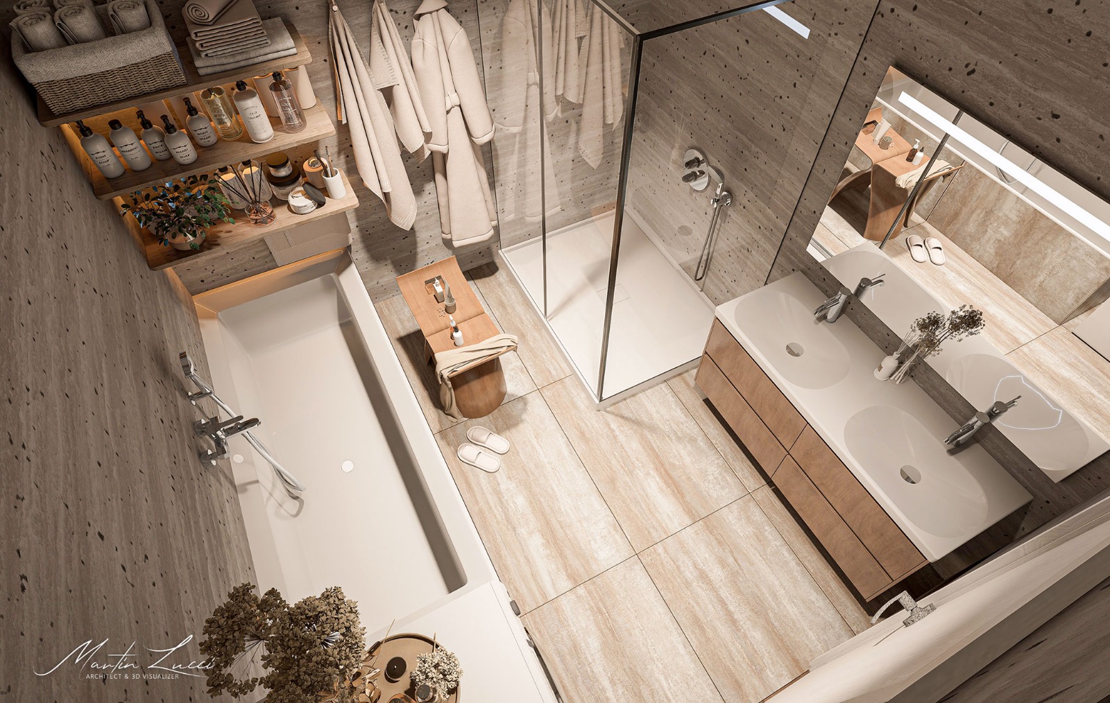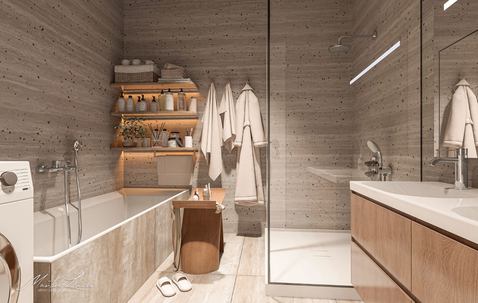Koupelny budou vybaveny podomítkovými vanovými a sprchovými bateriemi Grohe Smart Control, kvalitní sanitou značky Laufen a obklady a dlažbami od renomované italské značky Atlas Concorde.