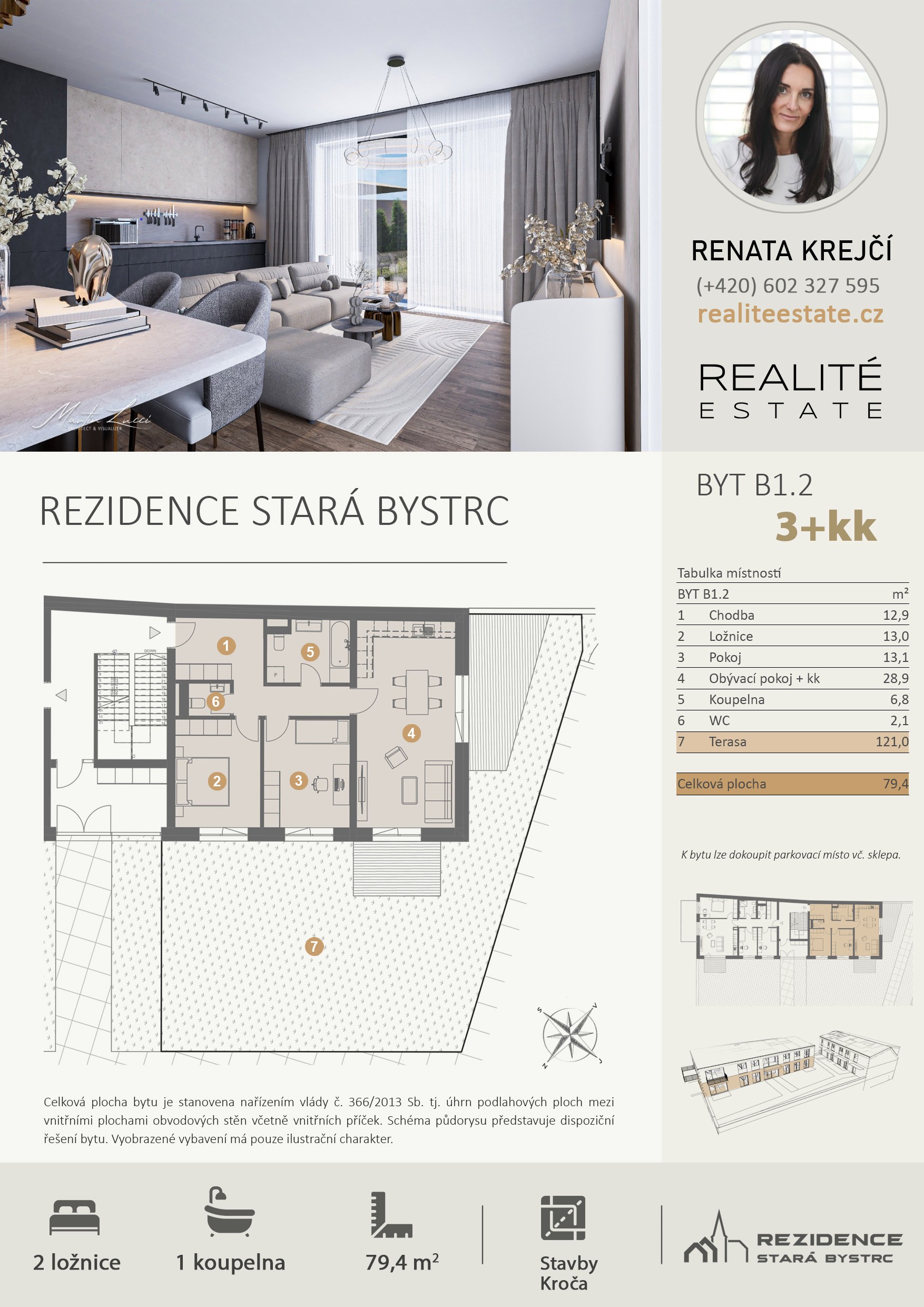 Byt 3+kk o celkové ploše 79 m2 + zatravněná terasa 121 m2